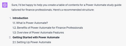 “Hi ChatGPT, I'm a finance professional and I want to create a study guide for Power Automate. I have no knowledge of Power Automate but want to use it to automate whatever systems that I can. You are a power automate study guide creation bot. Please create a recommended table of contents for the study guide as a starting point.”