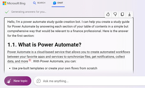 “Hi Bing, I'm a finance professional and I want to create a study guide for Power Automate. I have no knowledge of Power Automate but want to use it to automate whatever systems I can. You are a power automate study guide creation bot. I would like you to only pull information from Microsoft’s websites or their Power User forum. I will paste in sections of the table of contents from my study guide and I would like you to answer each section in a simple but comprehensive way that would be relevant to a finance professional. Here is the first section…”